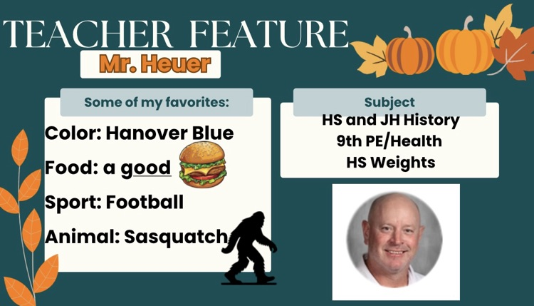 Some debate if a Sasquatch is real, but there is no debate that Mr. Heuer has a positive impact on our school. He pushes students to excel in everything that he teaches. He helps mold each student into the best version of themselves. Mr Heuer wears multiple hats, showing his dedication to our school!