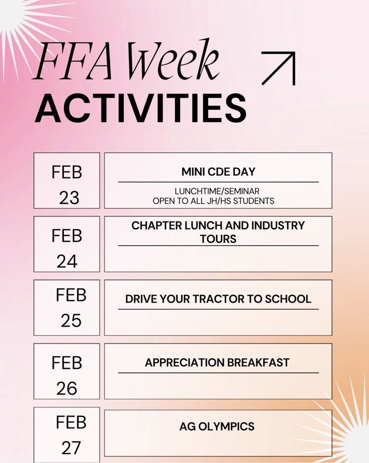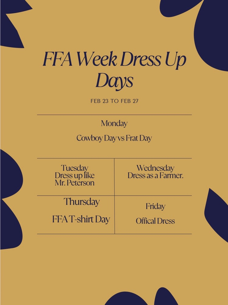 Next week is National FFA Week! Here is the information for activities and dress up days.